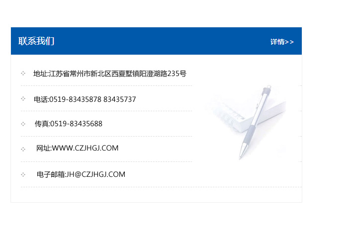 傳真:0519-83435688    郵編:213135    網址:WWW.czjhgj_com.jinhaokj.com    電子郵箱:JH@czjhgj_com.jinhaokj.com